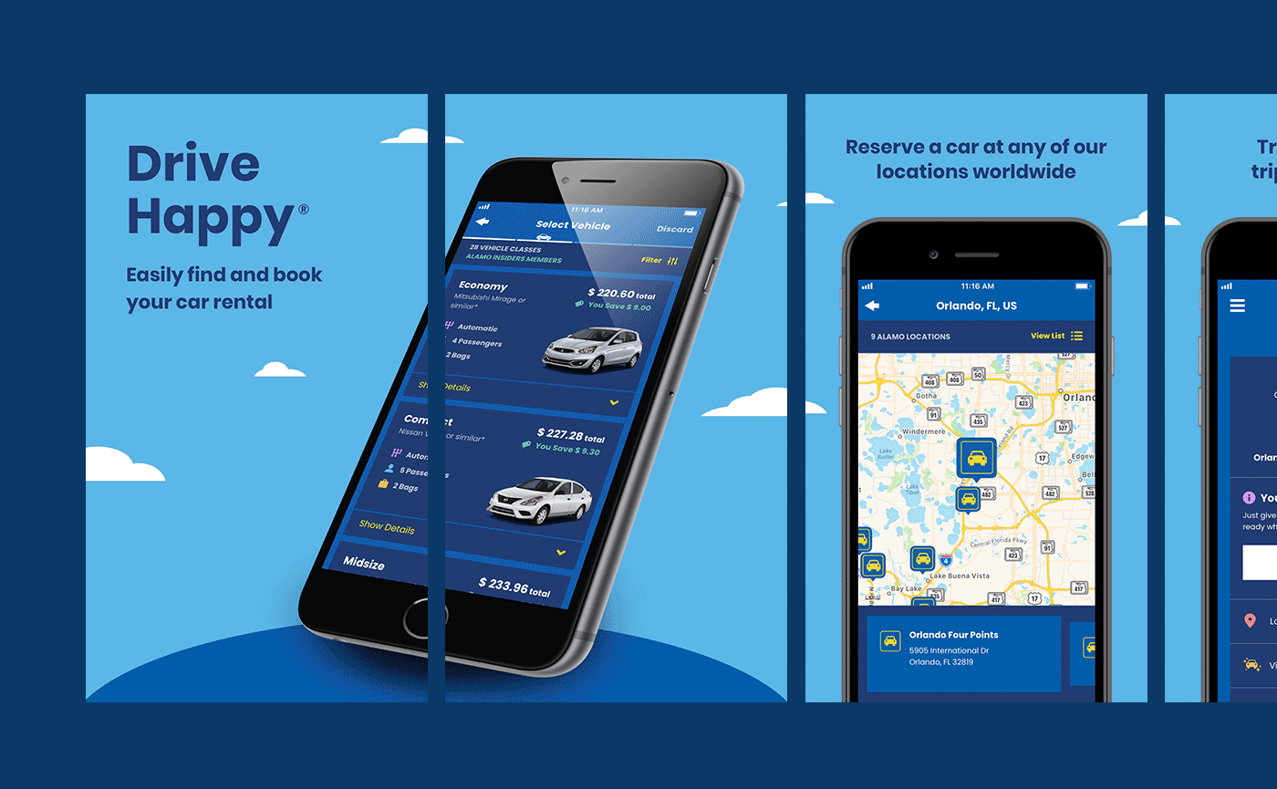 Alamo Rent a Car focuses on the leisure traveler market all over the world. For Alamo’s first mobile application, we created a bold look that reflects the brand’s helpful and fun personality, allowing the application to stand out against the competition. The finished product is a focused, seamless rental experience that’s sure to put a smile on customers’ faces.